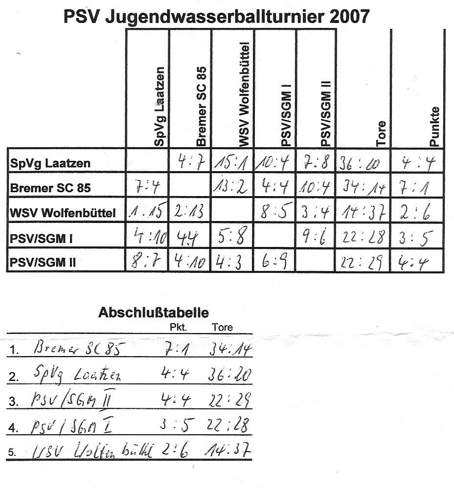 Am 9. und 10. Juni 2007 fand wie jedes Jahr das PSV- Jugendturnier im Annabad statt. Diesmal waren wir nicht ganz so viele, so dass der Spaß erst am Samstag losging. Die Mannschaften der Jahrgänge 92 und jünger genossen ein Wochende bei strahlendem Sonnenschein. Selbst das nächtliche kurze Gewitter brachte keinen Regen. Die vier zeltenden Mannschaften waren froh darüber ! Jeder spielte gegen jeden, so dass selbst bei nur 5 Mannschaften die Zeit gut ausgefüllt war. Die Stärke der Mannschaften war ziemlich ausgewogen, so spielte der Sieger Bremer SC 85 gegen den 4.-platzierten PSV/SGM 1 unendschieden. Auf dem 5. Platz landete die Mannschaft des WSV Wolfenbüttel, die allerdings auf ihren erkrankten Torwart verzichten mussten. Ersatz war dann aber durch die Torhüter der PSV/SGM 2 und des Bremer SC gefunden. Gegen die Mannschaft PSV/SGM 2 konnten sie auch einen Sieg verbuchen. Der vierte Platz wurde durch die C-Jugend-Mannschaft PSV/SGM 1 des Veranstalters belegt. Aushilfsweise hat auch die Mannschaft PSV/SGM 2 mitgespielt, die eigentlich die B-Jugend des Vereins ist. Hier kamen aber auch ein paar Spieler der Jahrgänge 95 und jünger zum Einsatz, für einen von ihnen war dies sogar sein erstes „richtiges“ Spiel. Auf dem zweiten Platz landete die SpVg Laatzen, die sich nur dem Sieger und der (fast) B-Jugend PSV/SGM 2 geschlagen geben musste. Schließlich wurde der Bremer SC verdient Turniersieger.